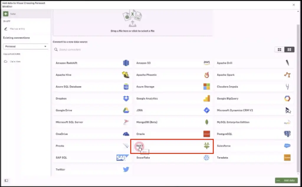The connection editor shows a list of data source connectors. To connect to the Visual Crossing Weather Data Services to load the historical data for your specified time frame please select the ‘REST’ entry.