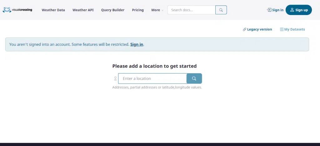 - Sign up for a free Visual Crossing Weather account here: https://dev.visualcrossing.com/weather-query-builder/