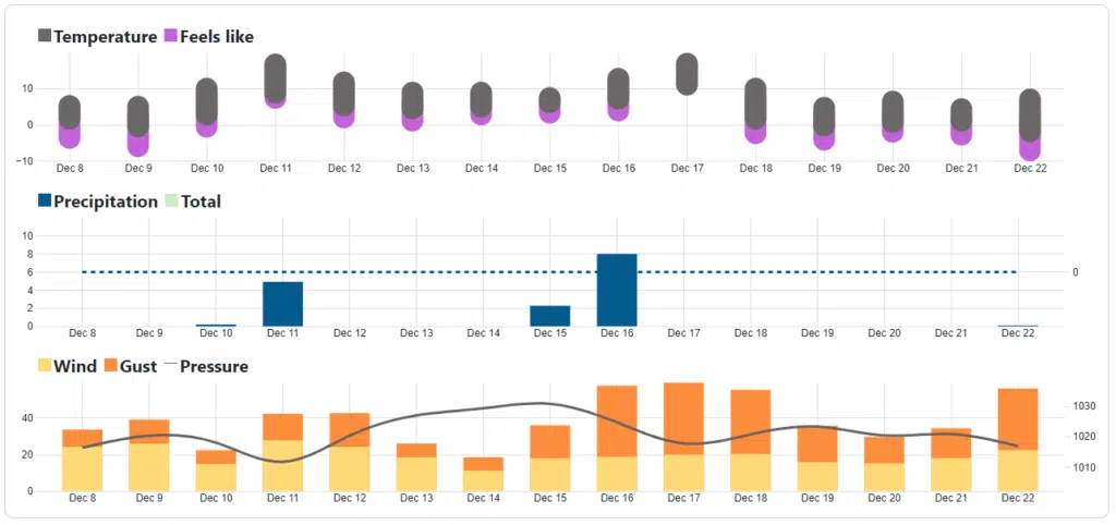The grid displays the full weather data in an easy-to-read table format. Data available includes the temperature, feels like (heat index and wind chill), precipitation, wind and many more weather elements. If you want to reduce the number of columns, you can use the ‘Weather elements’ link in the toolbar to make a custom selection.