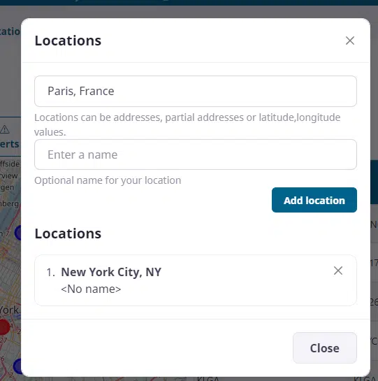 Simply add each location you need. Once you have finished, you can click ‘Close’