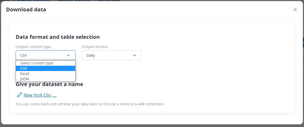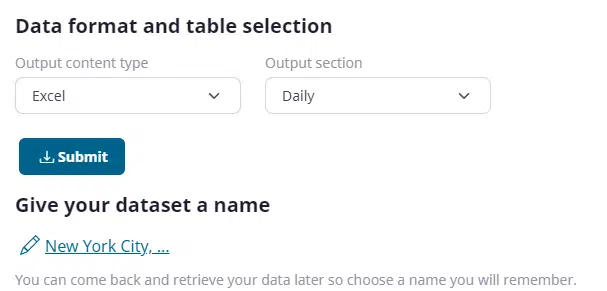 Optionally, we can also give the location a friendly name for our own reference in the output data. This feature can be useful when you are comparing multiple locations in the same dataset. Entering the location name is available once you have previewed your first dataset.