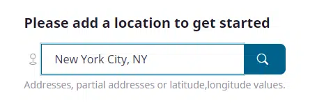 For the location, we can enter any address, a city name, a postal code, or even a latitude and longitude pair. If you enter a city name, also include the state and country if possible as there are many locations with the same town or city name!