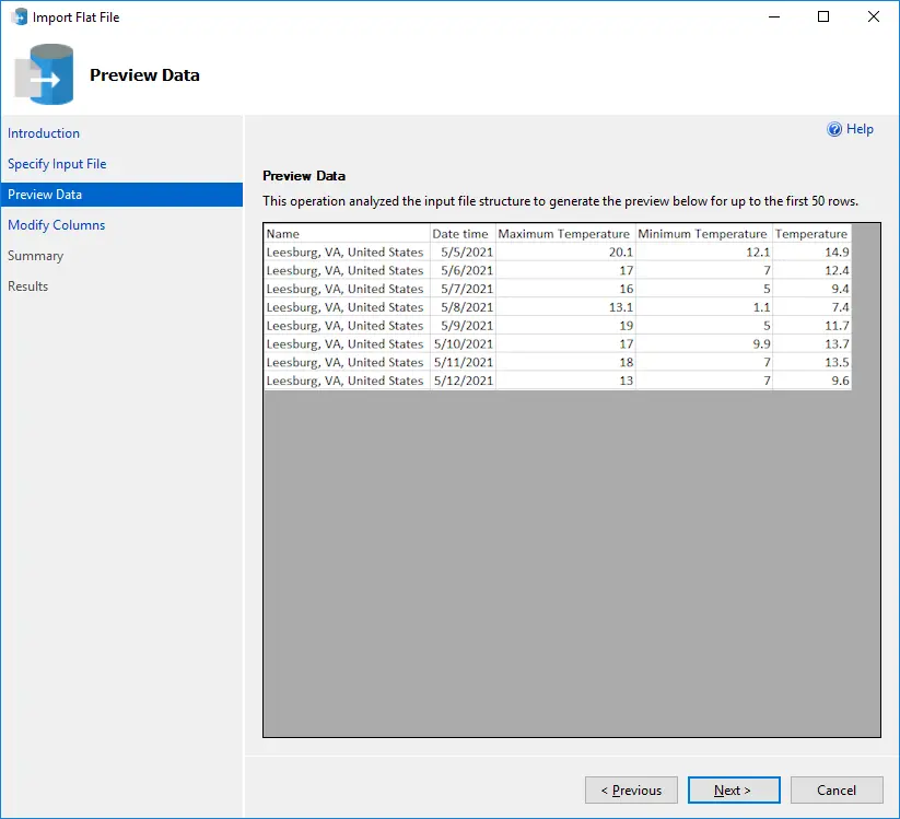 In the next step, the wizard will read the CSV file and show you the data that it finds to import. It will deduce that the top row contains header information while the remainder of the file contains the weather data. If everything looks OK on this screen, you can hit the Next button to move onto the next step