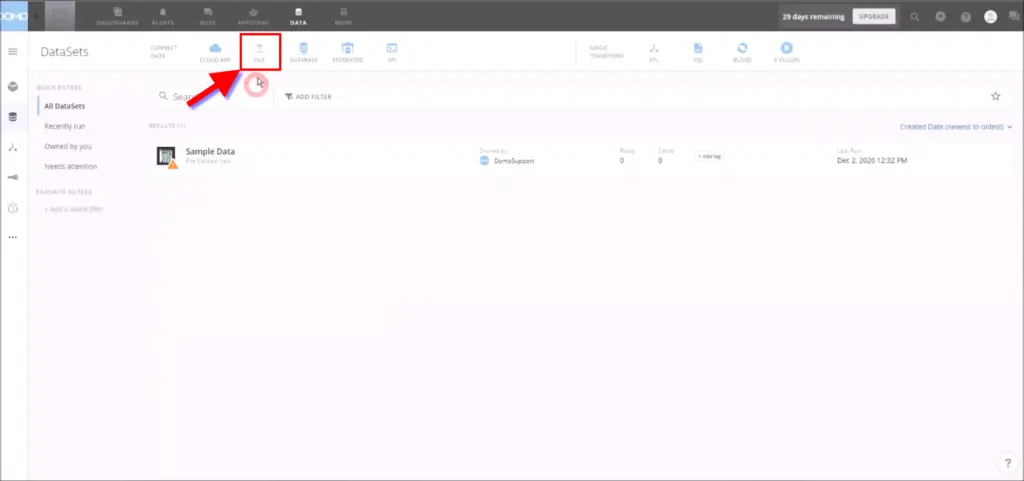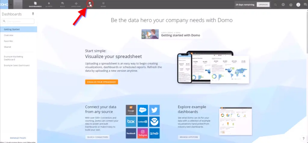 Once logged in into your DOMO Business Cloud select the ‘Data’ icon from the menu bar.