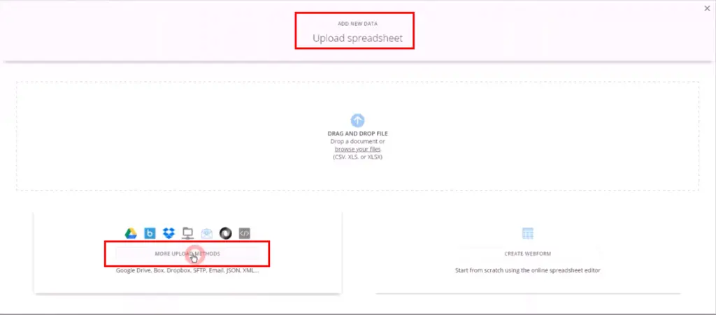 On the ‘Add new data upload spreadsheet’ click the ‘More Upload Options’ button.