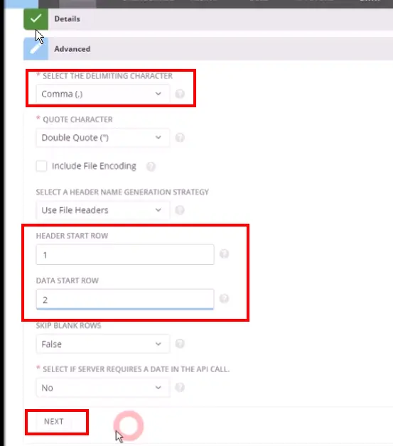 Additional settings to be set are in the ‘Advanced’ section where you need to confirm the delimiting character being set to ‘Comma’ and set the ‘Header Start Row’ to ‘1’ and the ‘Data start row’ to ‘2’. Click the ‘Next’ button afterwards.