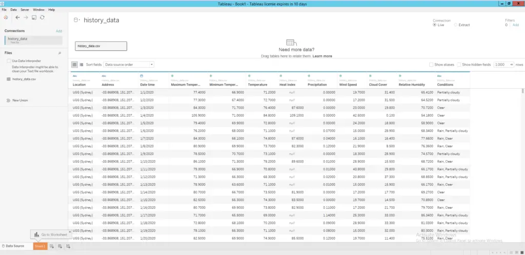 Step 5 – Load your historical weather data CSV file into Tableau Desktop