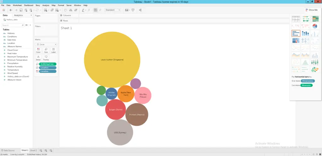 Now that the weather data is loaded into Tableau and you can start your business analysis in worksheets, stories and dashboards using the full functionality of your Tableau environment. Like in the below example visualizing the heat index in combination with the location performance.