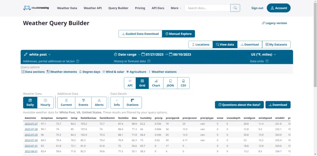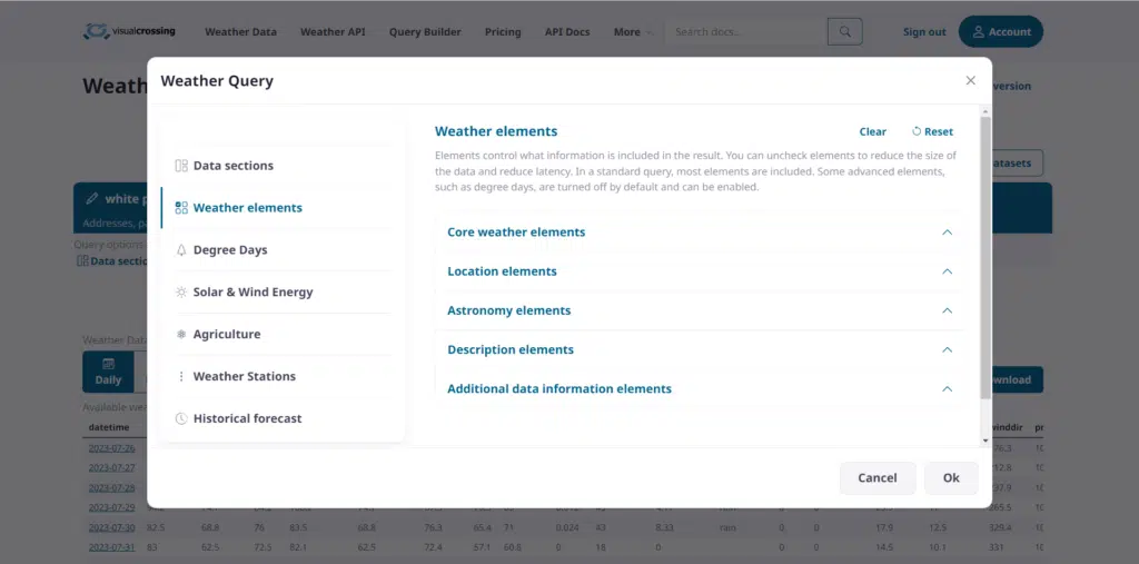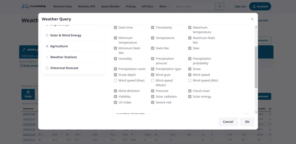 Click on the weather elements that you want to add or remove from the final data output. Checked elements will be included in the query results and unchecked elements will not be included.