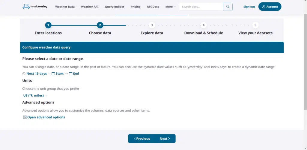 One you enter the Guided Data Download wizard, you will first need to select your locations. Then, in step 2 you will see the “Open advanced options” selection. Click it to open the advanced options window.