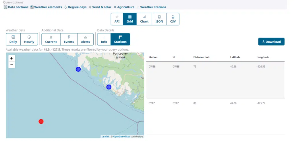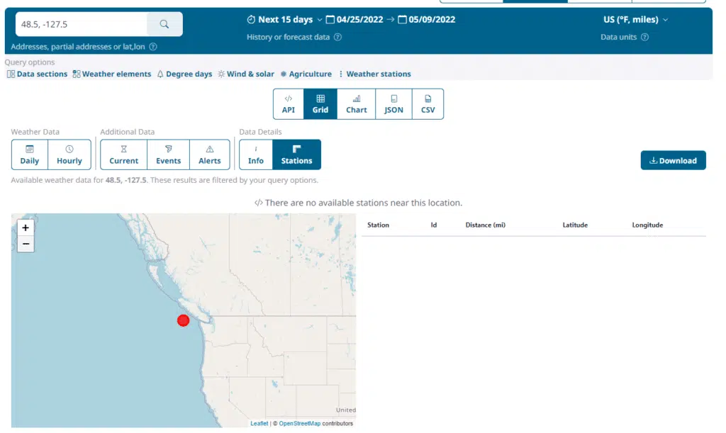 For our demonstration, we will use the location with latitude 48.5, longitude -127.5. This is an ocean location off the coast of the Western USA. When we enter the location in the query builder and click on the Stations data button, we can see a map on the query page of the requested location:
