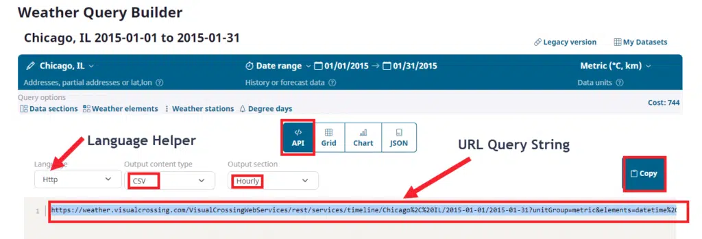 To match our file download we can choose CSV and Hourly options. You can see a preview of your URL Query String and use the “Copy” button to put the string in your buffer for use in your scripts or other applications.