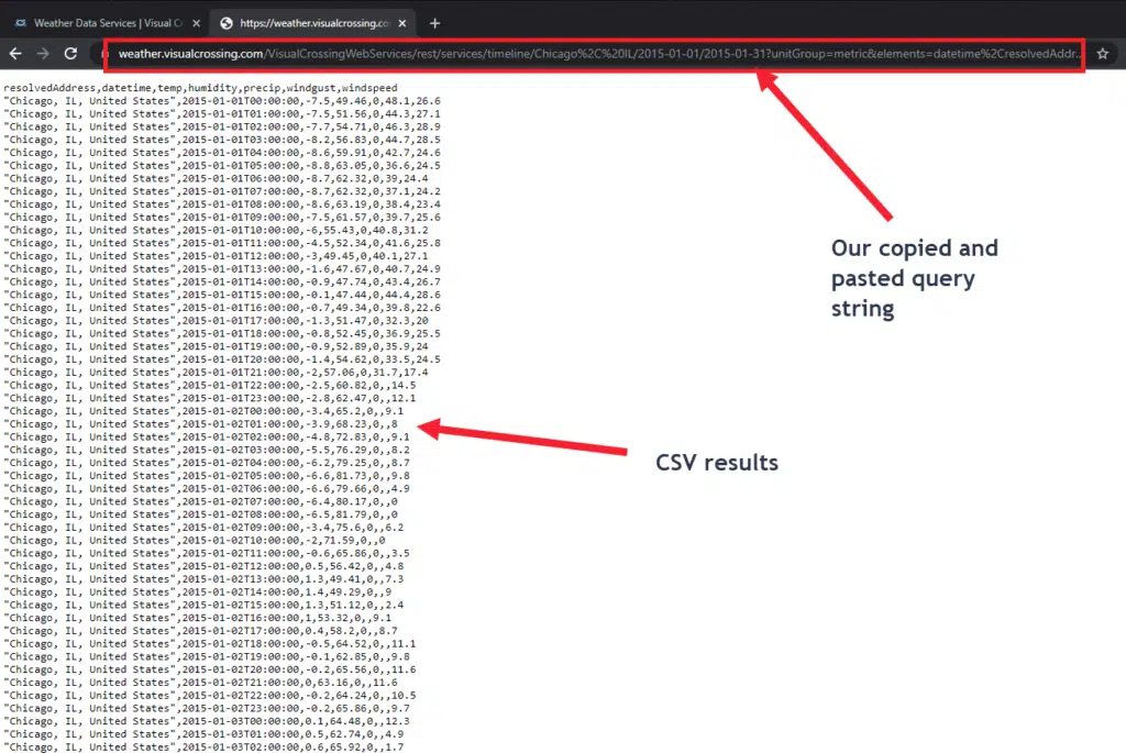 As mentioned in the opening paragraph, there are 3 main ways to retrieve your data. We will do this for our sample weather history query for demonstration purposes. The name of this tool is Query Builder because it not only allows you to retrieve a file of data as we did above, but also that you can build a query that you can refresh, parameterize and call from applications, ETL scripts and data tools such as Excel to load data directly.