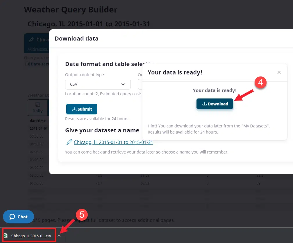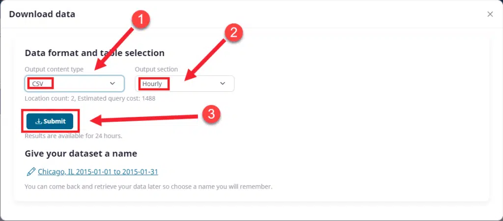 We can now simply click on the “Download” button to retrieve our data. Make sure to choose the ‘CSV’ option and ‘Hourly’ as our result dataset.