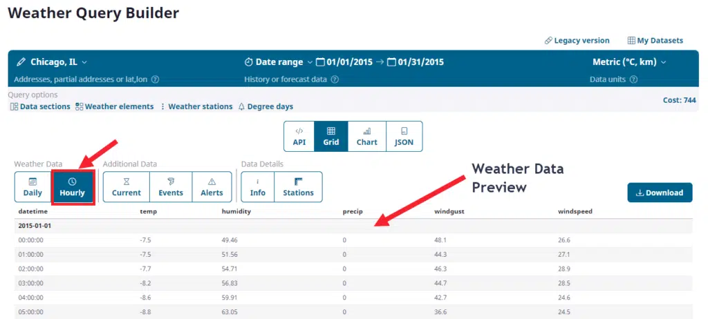 We can now see the preview of our new weather dataset and we can choose to view it by hourly data to make sure it represents the data we wish to download:
