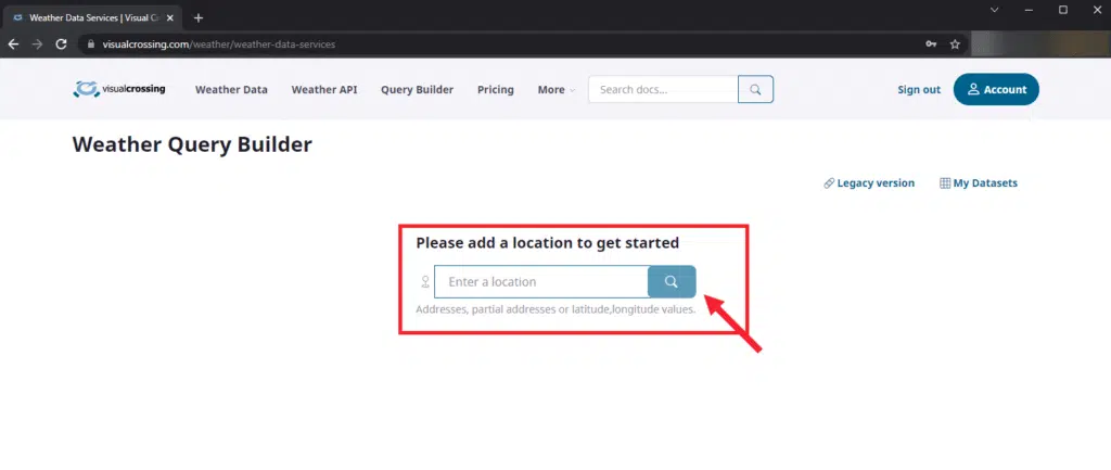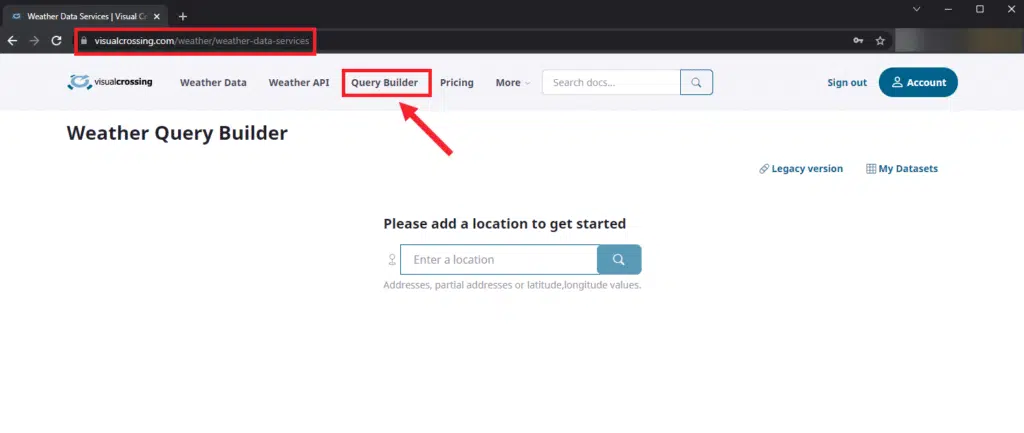 This article steps you through the process of obtaining weather data though the Weather Data Services page also known as the Query Builder. (seen below)