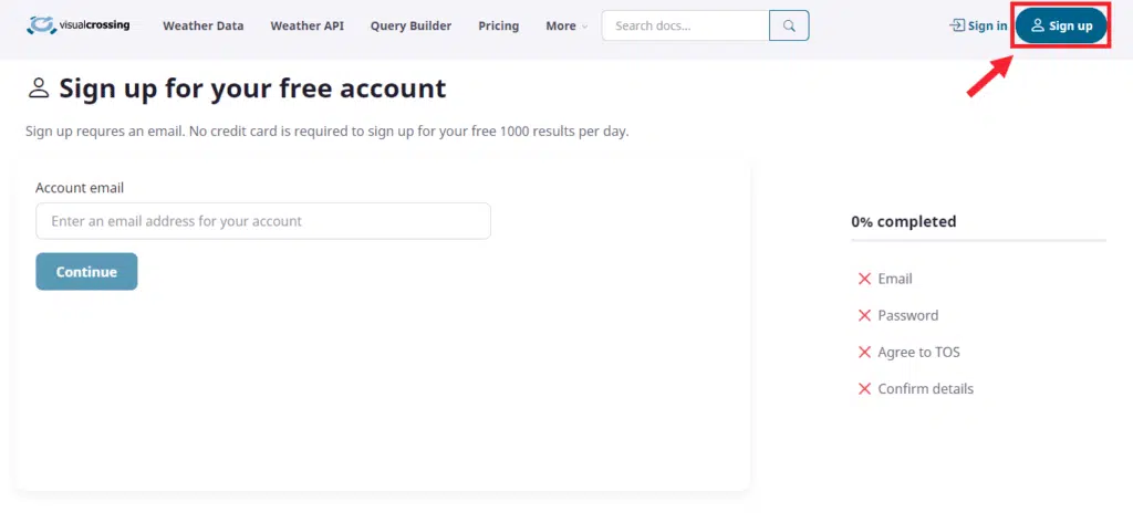 The Sign Up process will walk you through the steps to enter an email, validate the email and finally create a password.