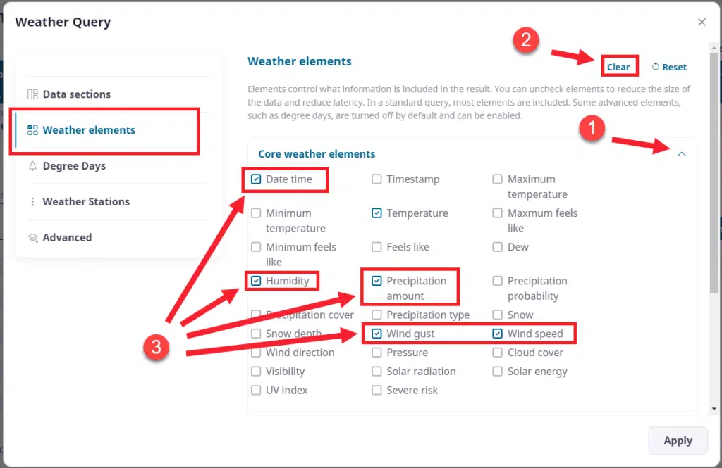 - Weather Elements – This section allows users to select exactly the columns of weather they they wish to retrieve, including if they want station data included with the weather metrics.