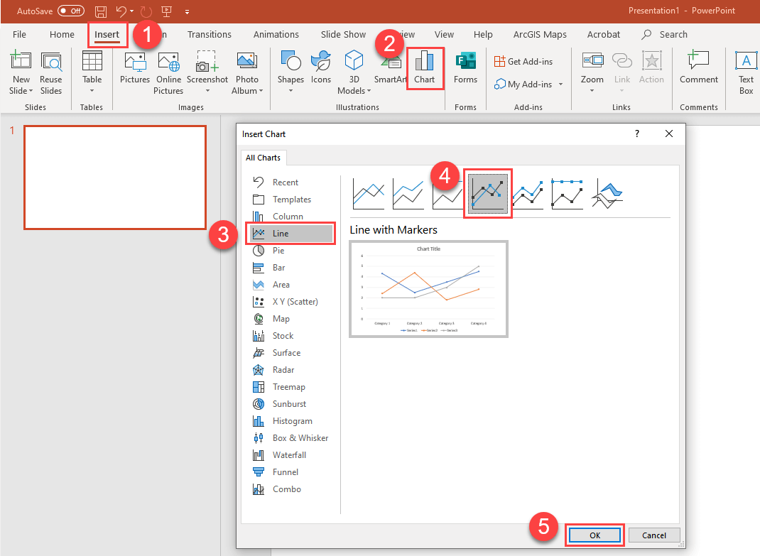 After you open your blank presentation, you can delete the default slide contents or create a new slide such that is doesn’t have any content on the slide. Next, from the ‘Insert’ menu choose the ‘Chart’ icon which will open a window from which you will select the ‘Line’ chart type, then choose the ‘Line with Markers’ icon. Finally we will click ‘OK’ at the bottom of our page.