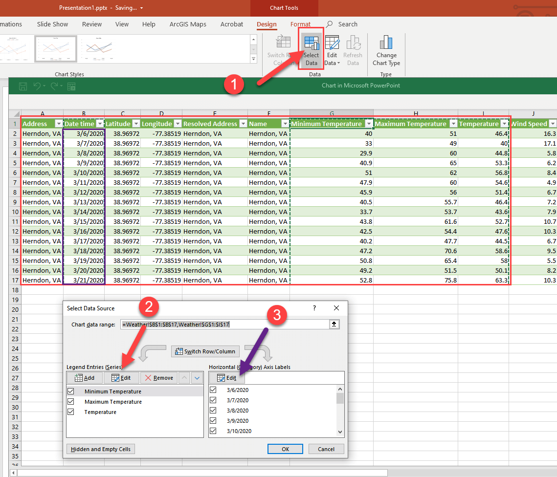 The final step in connecting the chart to our weather data is to change the chart series definitions. We do this by clicking on the ‘Select Data’ button on the Ribbon Bar while our chart is selected. This will open an editor that allows us to define both Axis series. First choose ‘Edit’ for the ‘Legend Entries Series’ and then select the table data from Address through temperature as seen by the red box below. Then choose ‘Edit’ for the ‘Horizontal Axis Label’ and choose the dates in column B called ‘DateTime’.(don’t choose the date column header as we only need the dates. This selection is highlighted by the purple box below. You should see the following:
