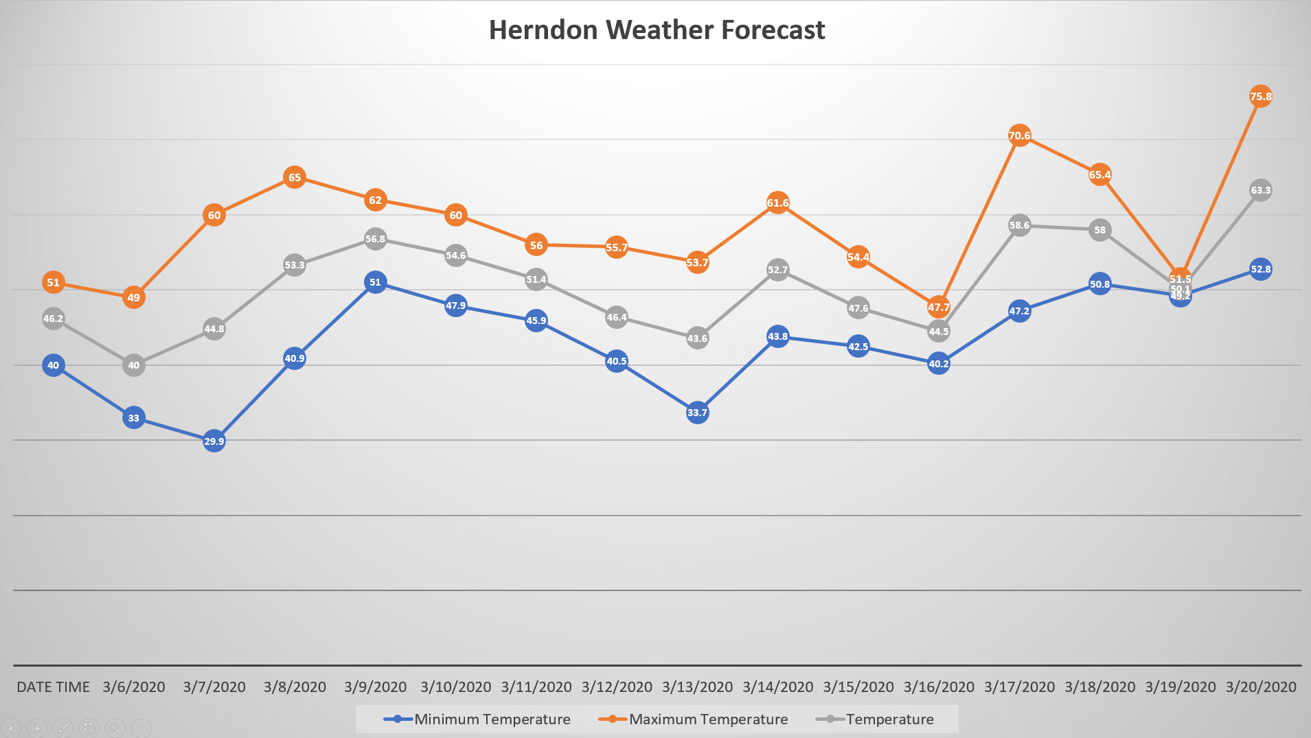 First we will change our Chart Title to ‘Herndon Weather Forecast’. Next, to keep this exercise simple we will use a predefined style for our chart by using the ‘Chart Styles’ button to the right of the chart. Here we will choose a pre-formatted style that appeals to us, maximize the chart to match the slide and then adjust any fonts as necessary. Here is our result: