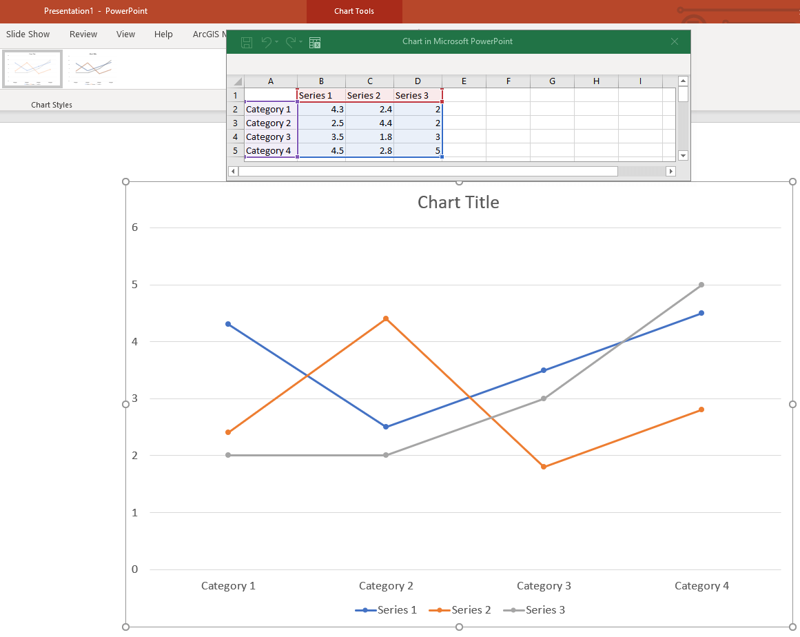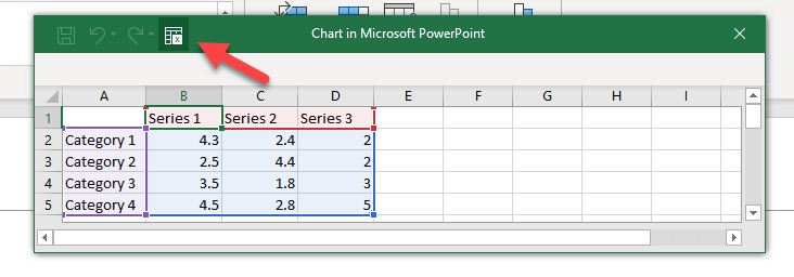 The first thing you may notice is that an embedded Excel workbook named ‘Chart in Microsoft Powerpoint’ is associated with our chart and will contain all of the data you need to create your graph. However the initial version of editing in Excel is too basic for our needs. To open the full Excel editor simply click on the ‘OpenInExcel’ button at the top of the Excel workbook.