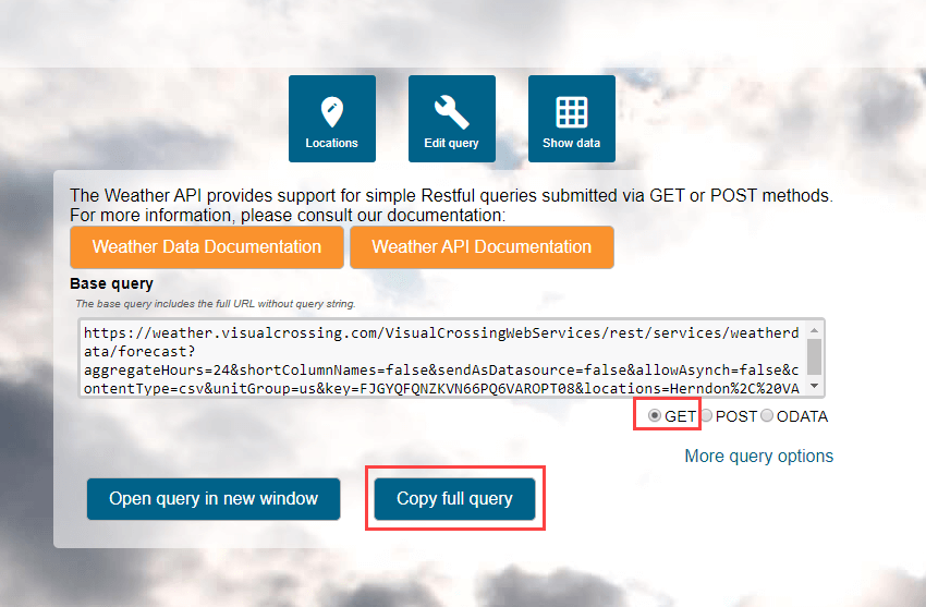 You should now see a 15-day forecast view for your location. Next we need to click on the ‘Query API’ button at the top of your forecast page where we can copy our URL that represents the query we just built. Click on the ‘Copy full query’ button to put the URL into your Copy/Paste buffer.