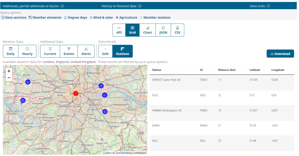Note that weather forecast data does not use weather stations and so will not report weather station information.