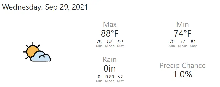 In some cases, adding a small amount of additional information can help improve the user ability to interpret the information. In the follow case, we have added normals to the KPI values. The user can quickly see that the predicted high temperature for this day is 88F (about 31C). They can also see that this falls close to the normal, average temperature for this date of 87F. Historically the high temperature has ranged from 78F to 92F.
