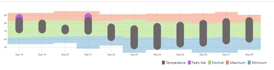 The chart is also able to convey to the consumer how the temperature compares to the historical temperature. The green color shows the typical range of minimum to maximum temperatures. The orange extends the range to the extreme high temperature and the blue the extreme cold.