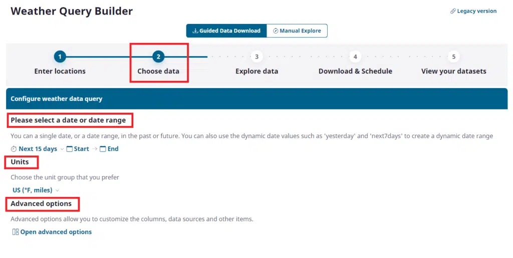 We have 3 sections to fill out: Dates for our weather data, Units of measure, and advanced options to pick out exactly what data elements will be included in the dataset.