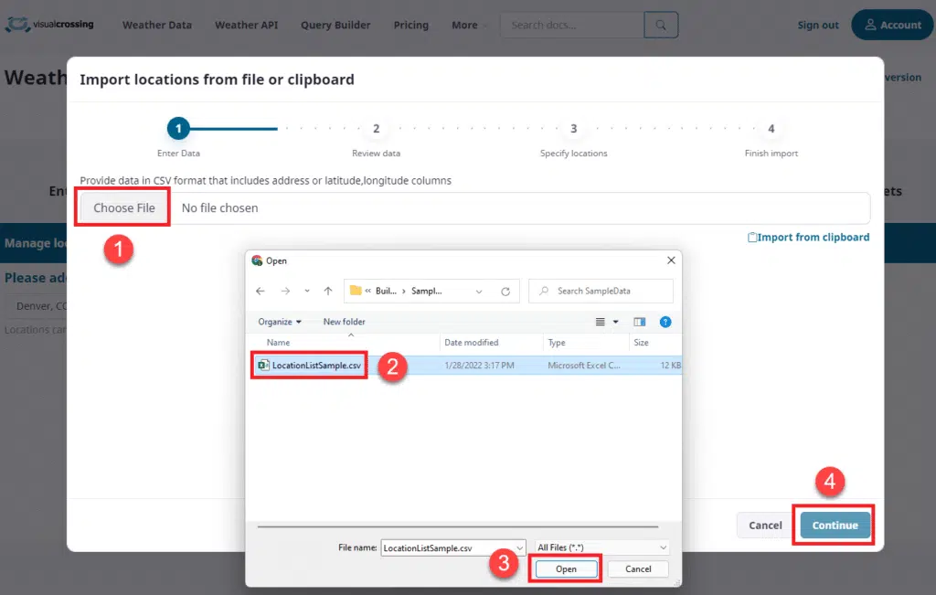 Here you can simply type addresses, lat/long values, cities, postal codes and hit the ‘+’ icon to manually add locations to the list. The other option is to load from a CSV (saved from Excel) or paste from clipboard. We will choose to import our dataset from a file. Once we click on ‘Import from file or clipboard’ the following options will appear: