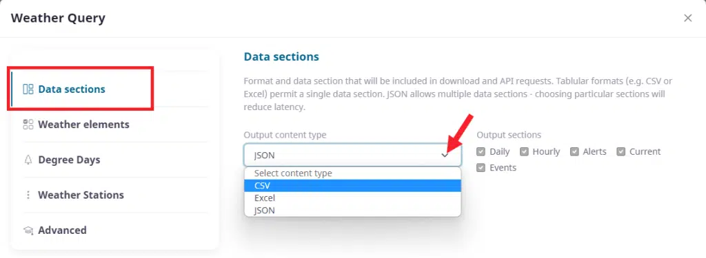 There are many pieces to choosing what data you want in your dataset and we will try to keep it simple. The first area is ‘Data Sections’ as we see above. Data sections are types of data you can have in your data set such as: daily weather, hourly data, alerts, events, current weather. We also have to choose the content type/format of the data. If you are a coder you will likely want JSON and if you are data analyst you will likely want CSV. If you work in Excel you can choose Excel or CSV.