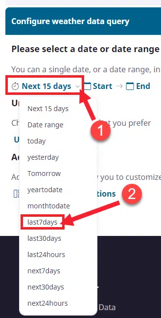 To pick your dates you can either choose from list of dynamic date macros such as ‘Today’ or ‘Last 7 days’ or ’15 day forecast’ OR you can choose to provide a specific date range from anywhere in the past (1970 or later) to the future. If you choose past dates you get station recorded data, if you choose 15-days into the future you will get model-predicted forecasts and if you go further than 15 days you will get a statistical forecast based upon 10 years of historical data for your location. The Timeline API that supports the Query Builder allows for a continuous timeline of weather. Let’s pick the dates we will use here: