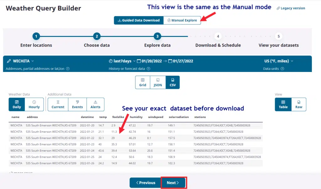 Note above that the Data Preview window has our exact query and a sample of the data that will return. In CSV mode we choose to view the data in this table format or the raw, comma-delimited format. If anything is incorrect we can use the ‘Previous’ button to fix specific items and return back to this view.
