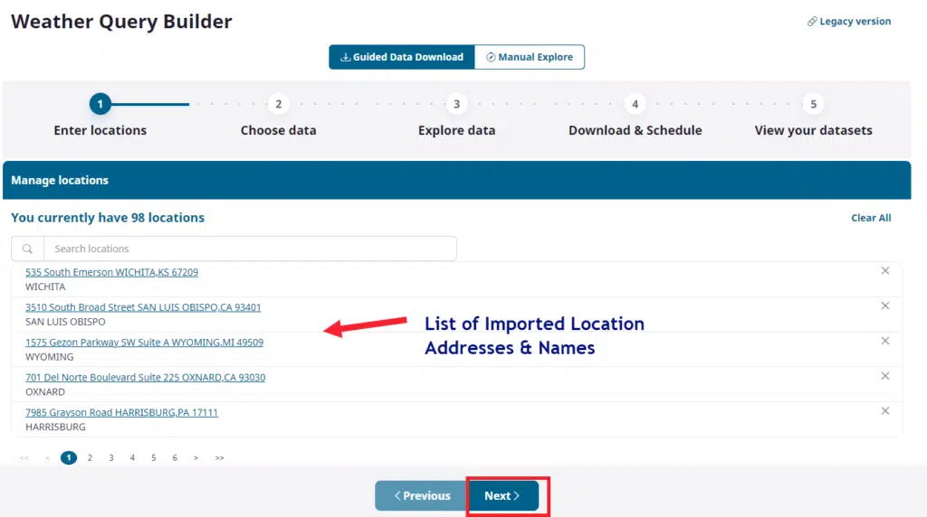 Here you can scroll through all imported locations if desired for validation. Once complete, simply click ‘Next’ to move onto our data selections.