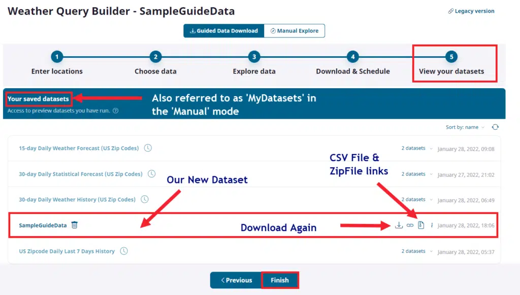 As long as the dataset exists in the system you can use these links to directly access your file dataset. More on this below in the ‘MyDatasets’ section.