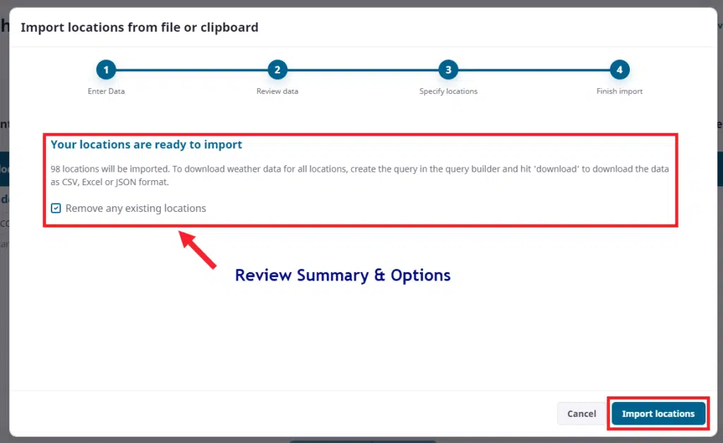 The final step on location import is to verify the number of locations and optionally ask the system to remove any prior locations you have from previous datasets. When you verify this information you can click ‘Import Locations’ to let the system complete its job.