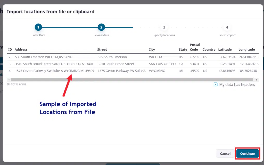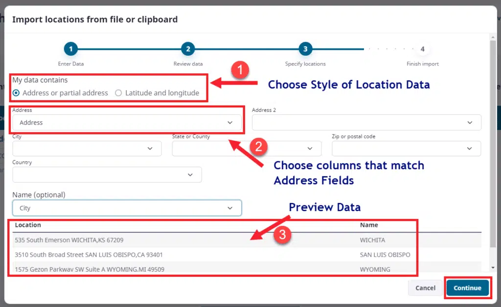 Finally in step 3 above you can see what final values you are giving to the system as your locations and name with examples from your file import. This is key to making sure that you don’t have repeated string data and in general that the addresses look complete and accurate.