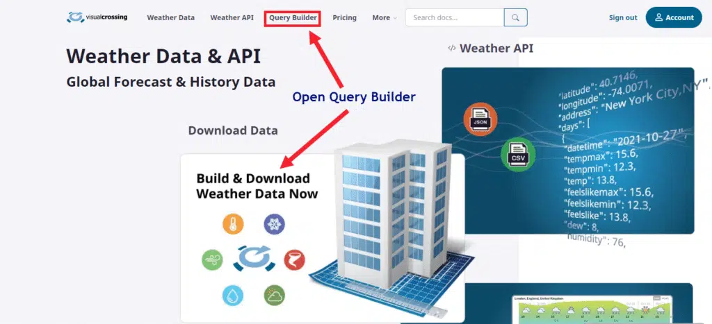 For this exercise we will use the Query Builder to create our the packaged dataset that we will download. To begin, login to your account on the Visual Crossing homepage and visit the Query Builder page: