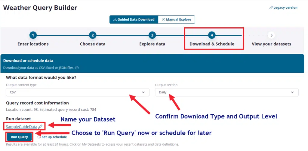 Confirm our ‘CSV’ selection and our ‘Daily’ weather granularity selection using the two popdown controls. Next click on the name of your dataset and rename it as you wish. Finally, if you are ok with the purchase click on the ‘Run Query’ button and the system will execute your query. Depending upon the size and type of data this may take a few minutes to run. When complete the system will ask you if you wish to download the data: