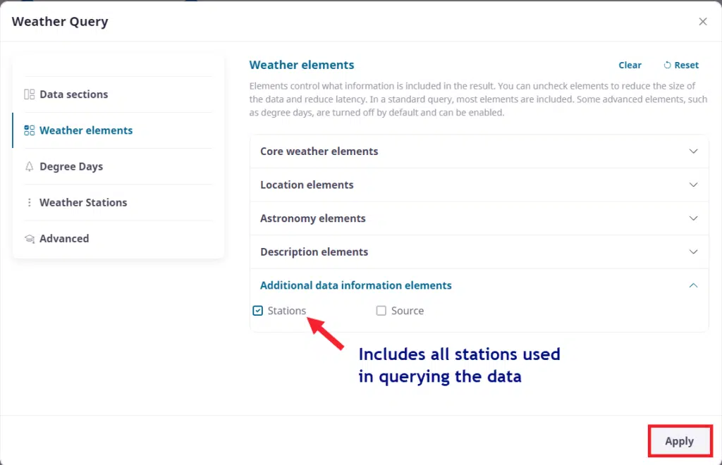 If users wish to see what stations contributed to their data they can go back and include station information as a column in the ‘Additional data’ section of the weather elements