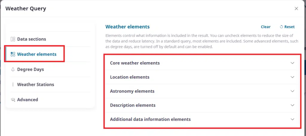 Here we can simply check/uncheck weather elements that we need. Be careful if you choose the ‘Clear’ option at the top as it will clear more than just what you see in the ‘Core weather elements’ section. Remember to scroll down and choose other columns of data such as our location columns and more.