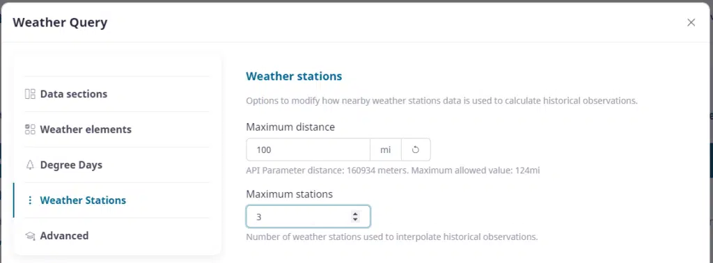 One of the most important areas of your data selection is the area to define station data. The Visual Crossing service is based upon a system of interpolation to give users a custom weather for their location. By default 3 stations are used to interpolate data for any position on earth. Users can define here how many stations are used, as well as how far our system can reach to use those stations. Rural locations may need to reach further than the defaults to retrieve data.