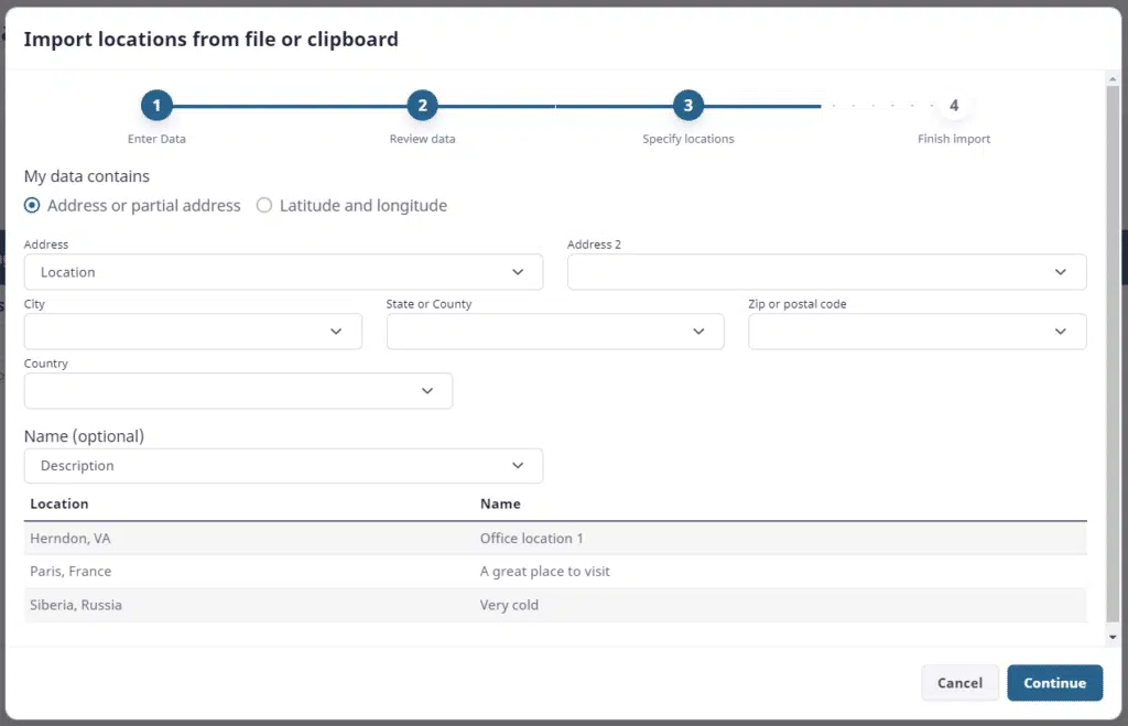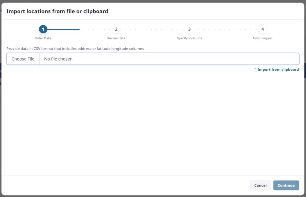At this step you can choose to enter locations manually one at at a time, import a CSV file containing your locations, or paste in CSV data from your clipboard. Since multiple locations are best imported vs. being entered manually, we’ll select a CSV file on our computer containing our list of locations. To start the process click on the link to the right that says “Import from file of clipboard.”