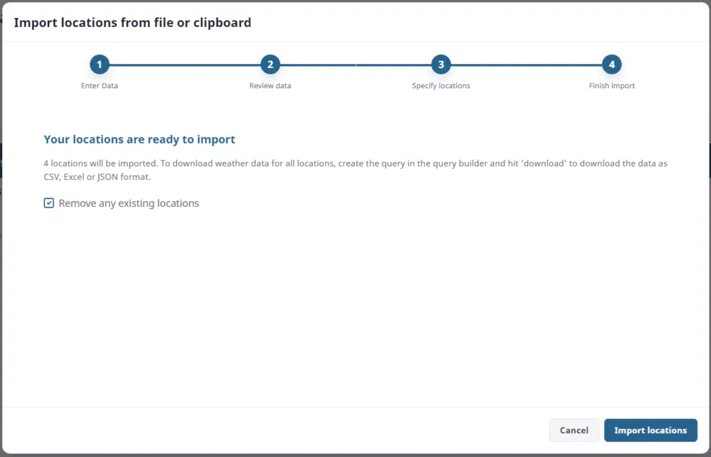 When you have made your selections, click Continue. The final step will tell you the number of locations as well as allow you the option to combine these new locations with any old locations that you may already have loaded. In nearly all cases, you will want the new locations to replace any old ones, so you should leave “Remove any existing locations” checked. When you are ready, click the “Import Locations” button to close the importer and return to the data download guide.