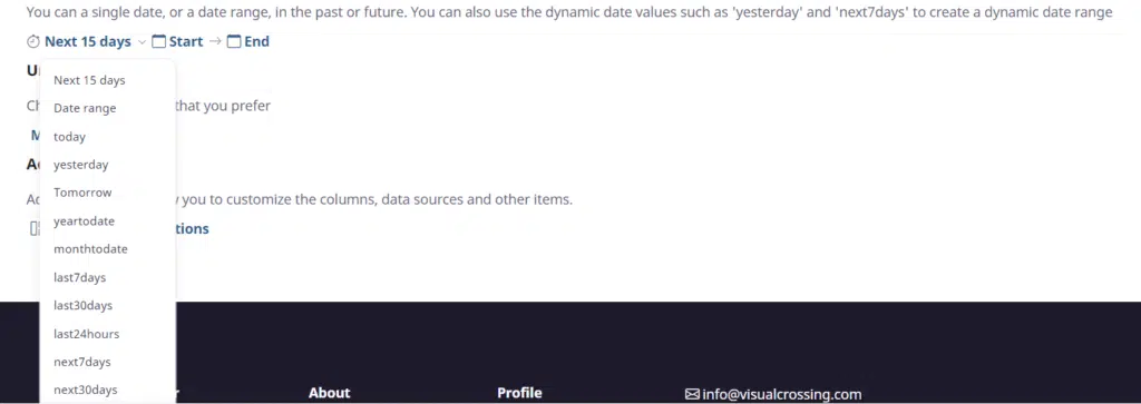 Now, we need to choose the date or date range and unit system for our query. For the date, you can either select one of the pre-configured date options supported by the weather engine or select your own date range manually. The benefit of selecting a pre-configured, dynamic option is that every time the query is run, the correct date range will be used. For example, if you select “Next 15 days” the Weather Engine will automatically return data for the next 15 days no matter when you run the query. If you run the query at the beginning of January, you will automatically get data for the first 15 days in January. If you run it at the beginning July, you will get data for the first 15 days in July, and this happens without any additional effort on your part. If you plan to run this query as a scheduled task (see below) or even more than once, using a dynamic date option can save you effort and avoid getting unexpected results. To learn more about dynamic time periods, you can read our article on this topic.