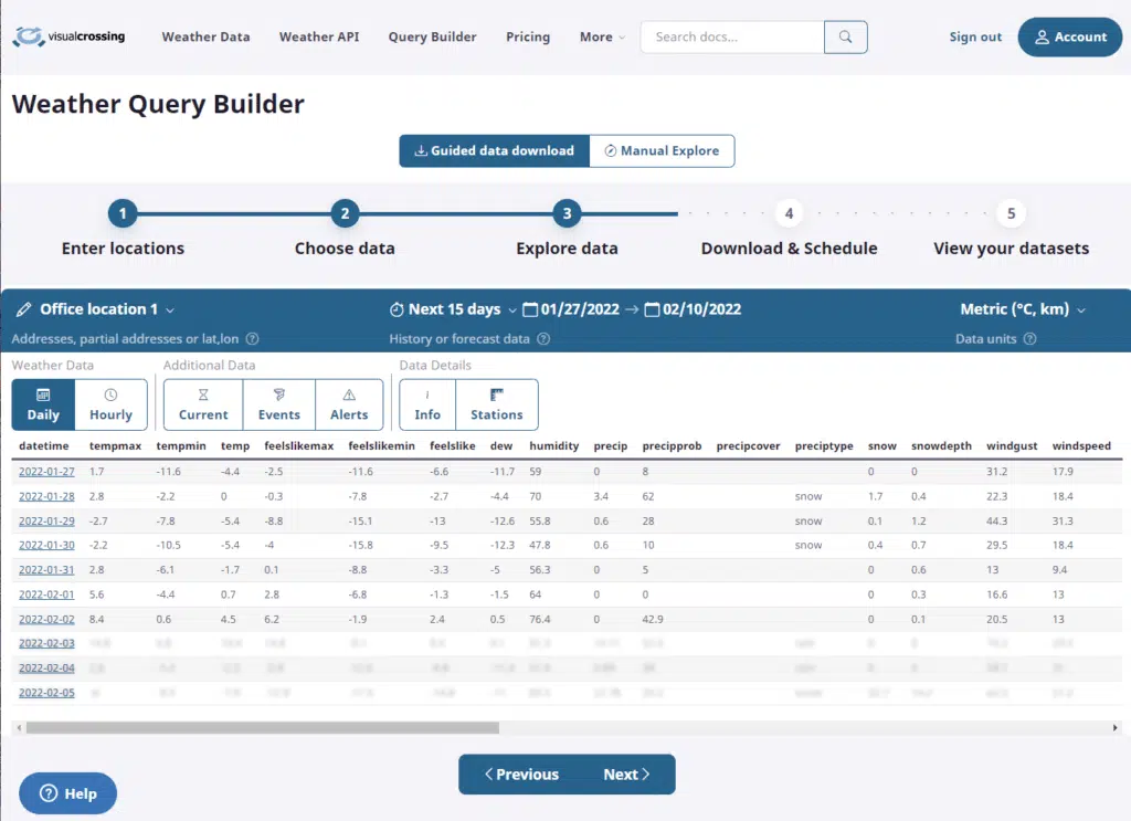 The two main actions to consider on this panel are the “Run Query” and “Set up schedule” options. The “Run Query” option runs the data immediately against the query. This is the most common option and the one that will be use in this article. However, depending upon your plan level you may also be able to schedule your queries to run every day at a fixed time. This option can be very valuable allowing you to get fresh data results every morning, evening, or whenever weather data is important to you. You will be able to access this data via a custom link that you can then download directly or load into Excel or other tools. If you want to learn more about setting up and using a scheduled web query, please read our article “How to schedule weather data queries.”