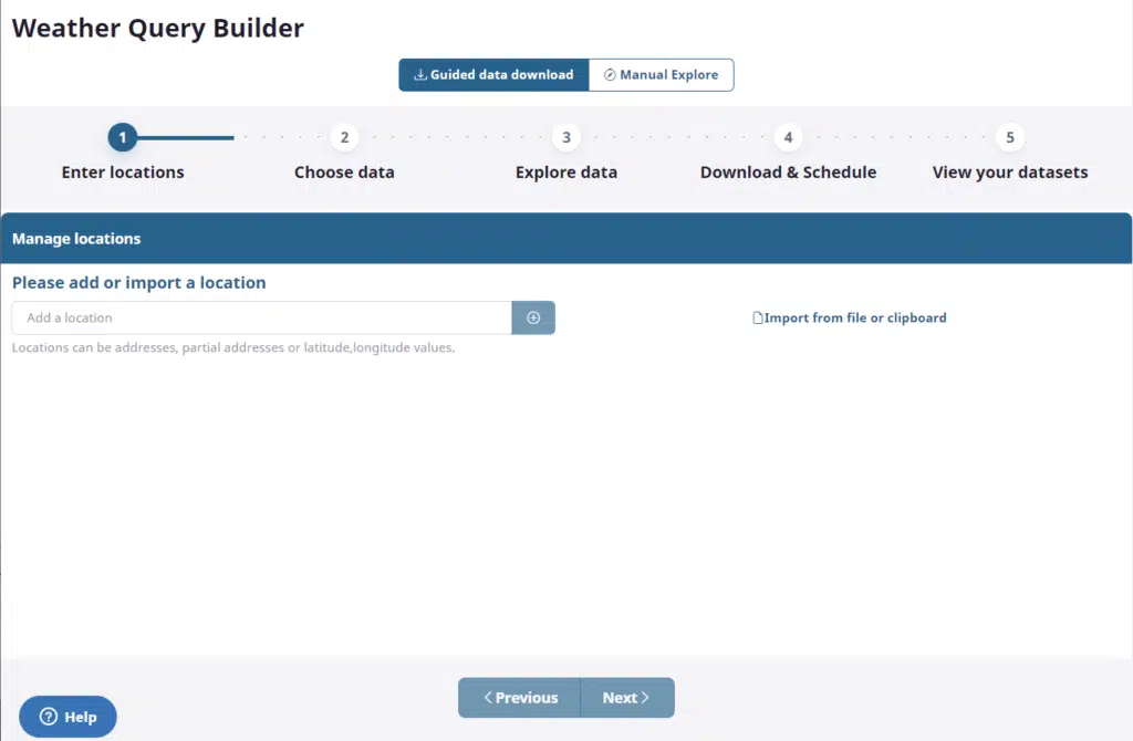 Downloading weather data for multiple locations in CSV, Excel, or JSON format is easy using our Query Builder page. In this guide, we will walk through the process of uploading a file of location or pasting in CSV data from the clipboard, composing a weather query, previewing weather data for these locations, and then downloading the result data for that query to our local computer for later analysis. To make this process extremely simple we will use the Guided Data Download functionality that walks us through the process step by step.