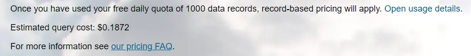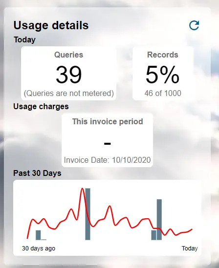 Watch your account usage dashboard – On your account page you will find the link to your usage dashboard. This dashboard shows you the number of records that you have used against your account limits and the summary of any billable queries that you have made.